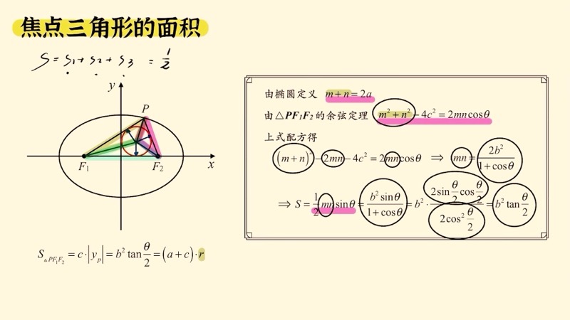 \[S_{\triangle F_1PF_2} = b^2 \cdot \tan\frac{\theta}{2} \quad \text{(椭圆)}\]