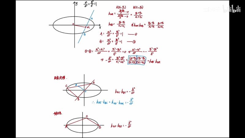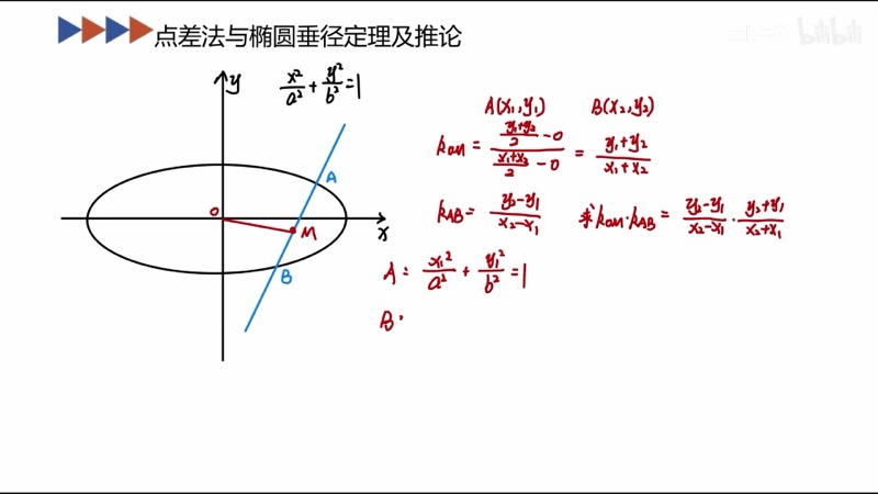 设中点 \(M(x_0, y_0)\),则 \(x_1 + x_2 = 2x_0\),\(y_1 + y_2 = 2y_0\)。弦斜率 \(k_{AB} = \dfrac{y_1-y_2}{x_1-x_2}\)。